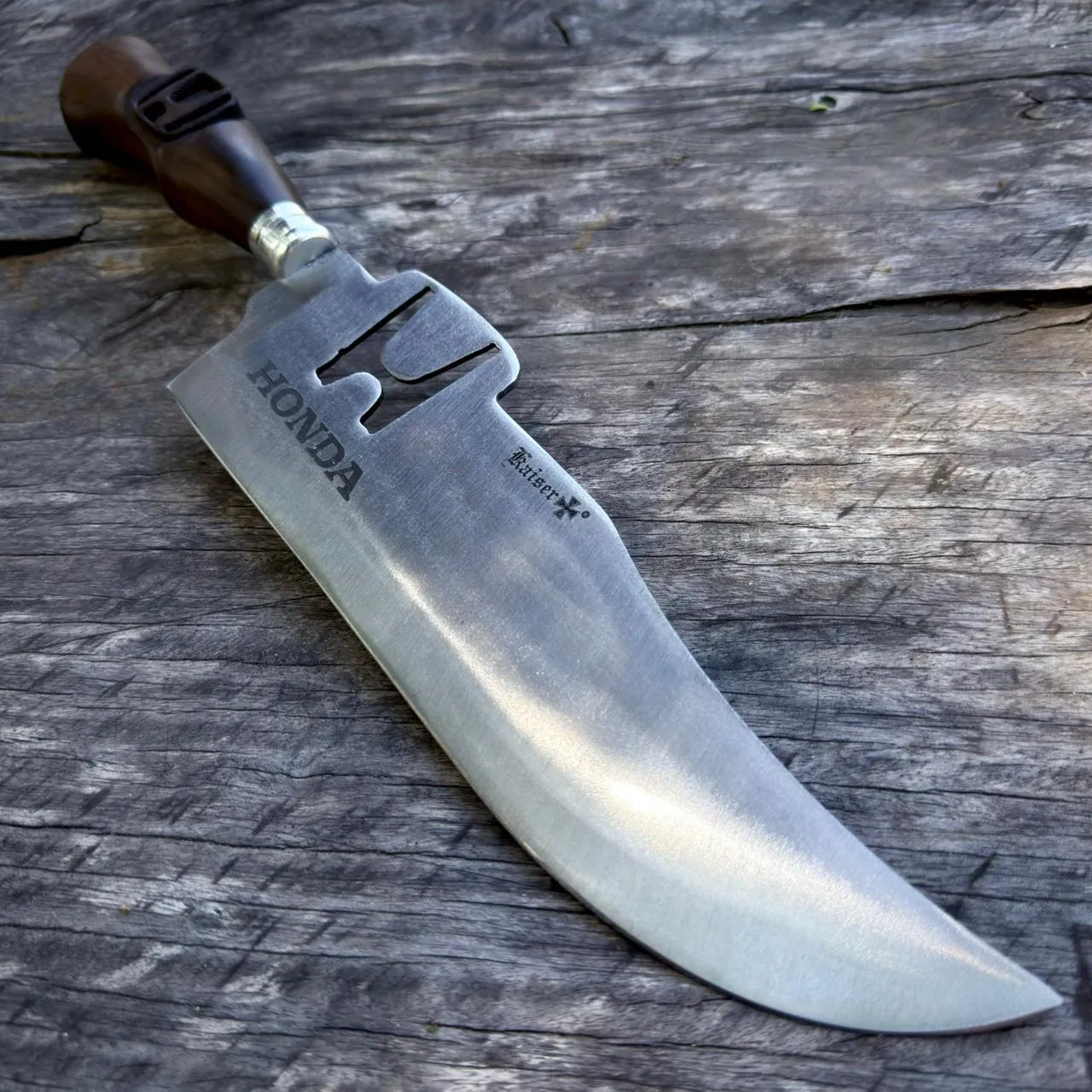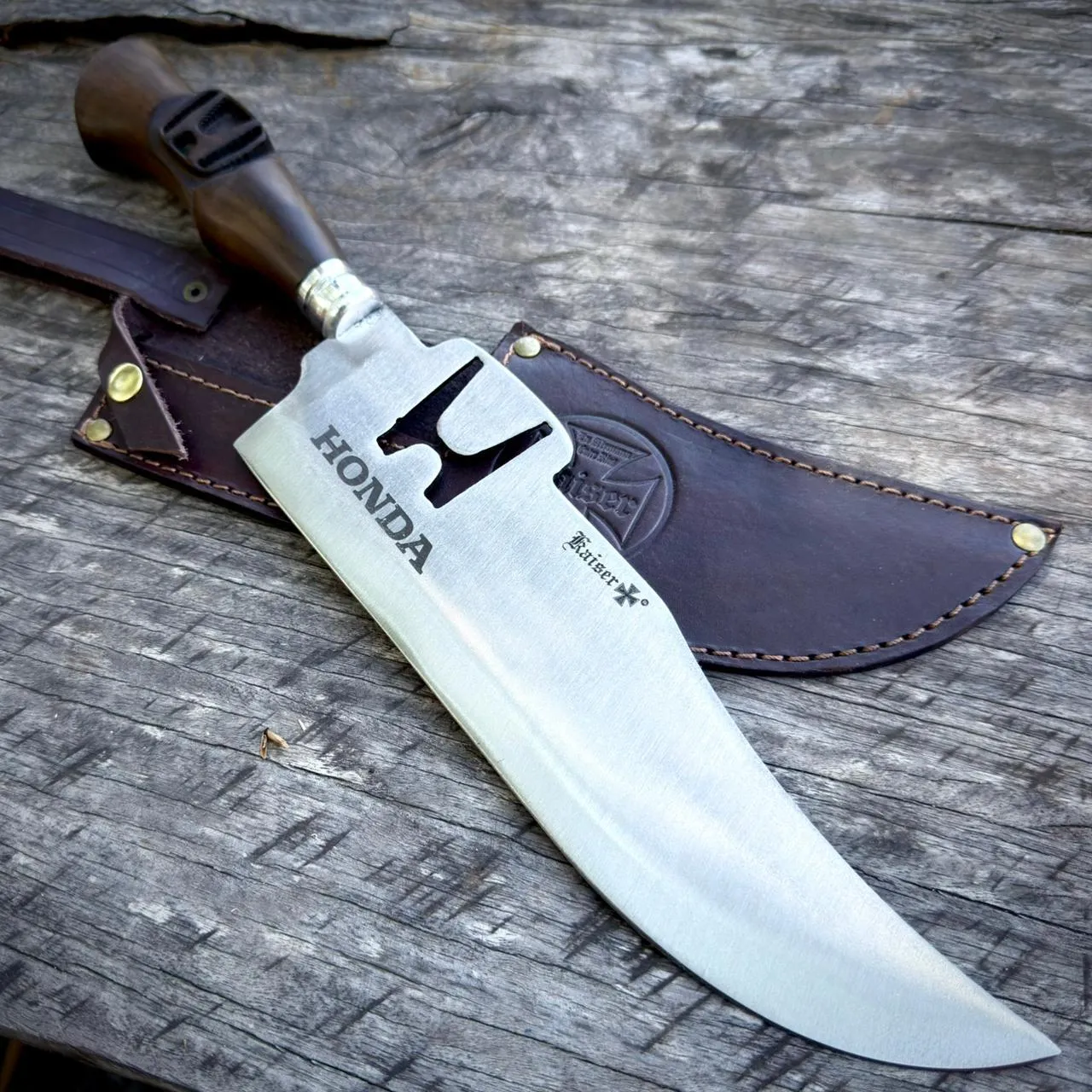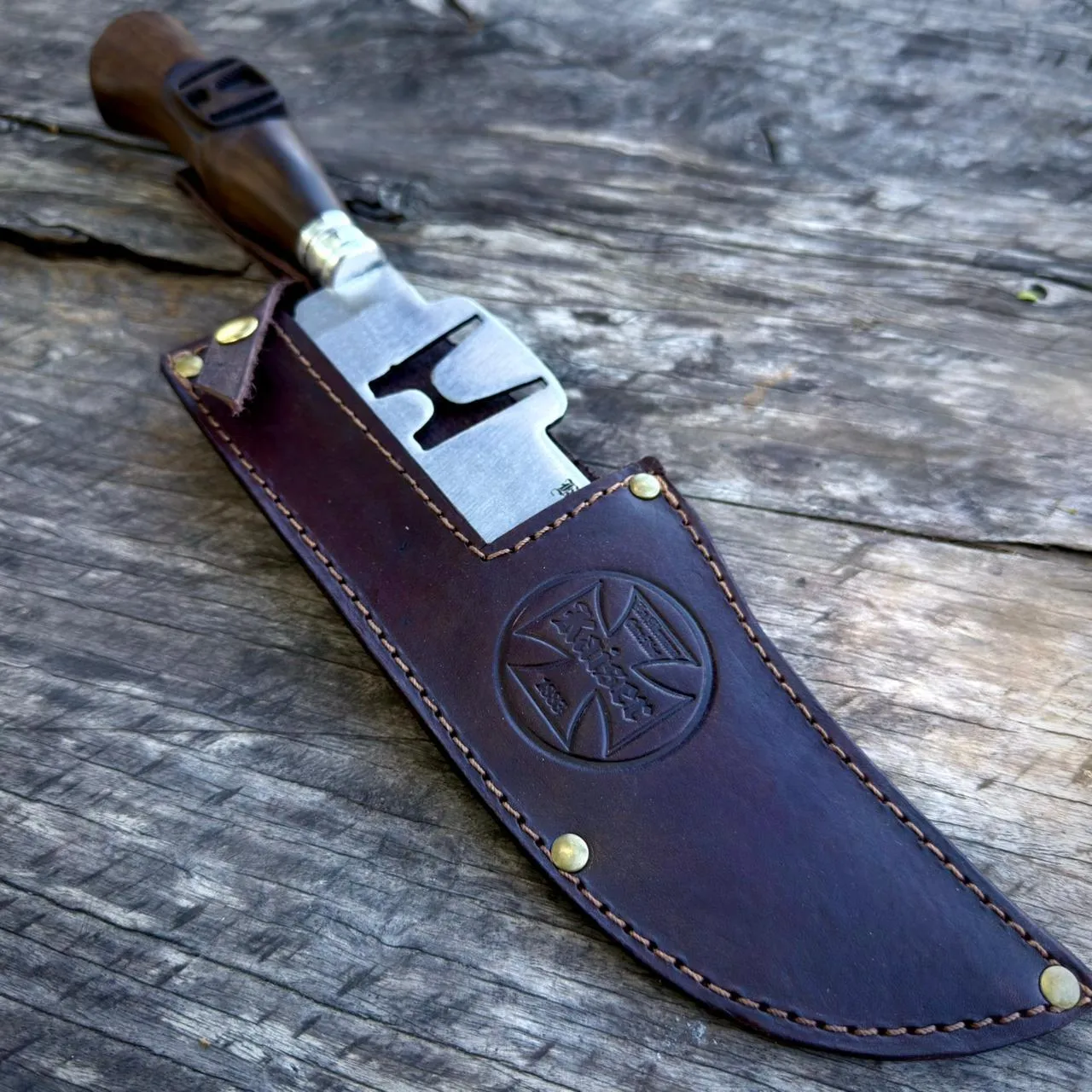 Va afilado y con su vaina de cuero auténtico.